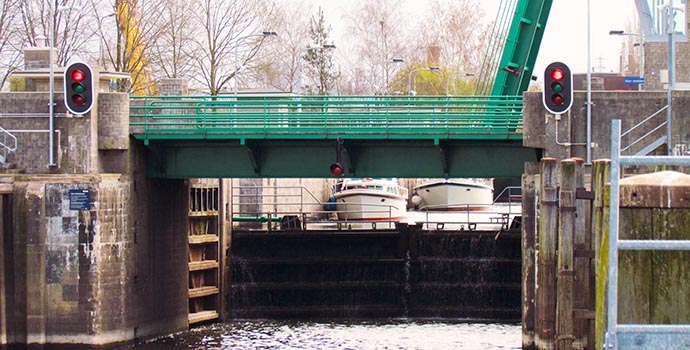 De schutsluis heeft drie sluishoofden waarmee in twee stappen kan worden geschut De kolk lengtes zijn 40,40 en 22,85 m. Elk sluishoofd is voorzien van een dubbele set puntdeuren die zowel naar binnen als naar buiten keren.